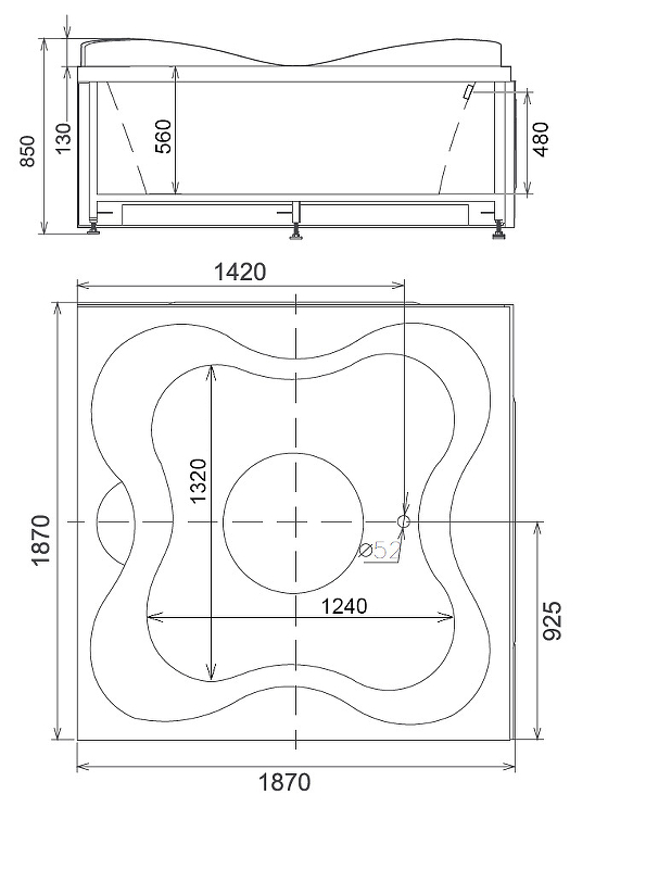 - Размер ванны (ДхШхВ): 187х187х85 см.
