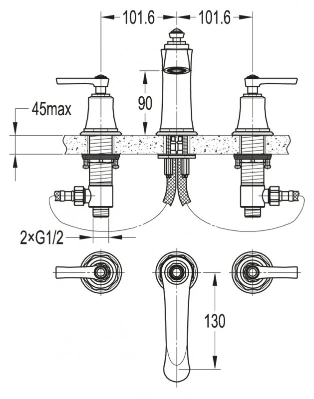 Смеситель на раковину на три отверстия без донного клапана в комплекте