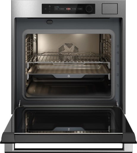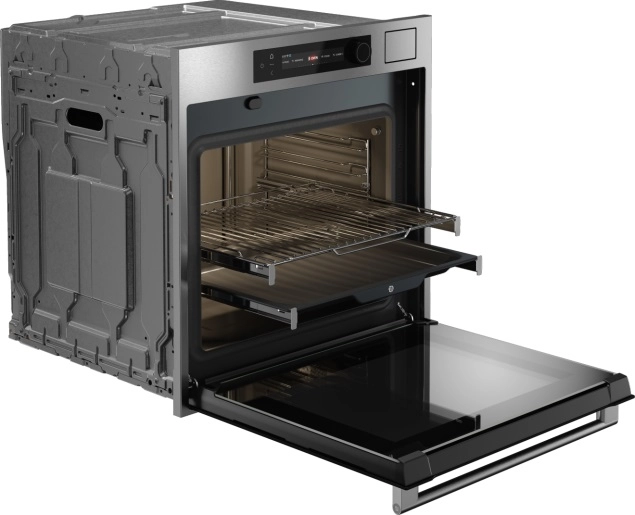 Безопасность и комфорт использования проработаны до мелочей. Дверца с тройным остеклением и внутренней системой охлаждения значительно снижает нагрев внешней поверхности, а плавное открывание и закрывание и телескопические направляющие на двух уровнях упрощают работу с противнями и решётками. В комплект входят два универсальных противня, один перфорированный противень из нержавеющей стали и решётка — всё необходимое для повседневной готовки.