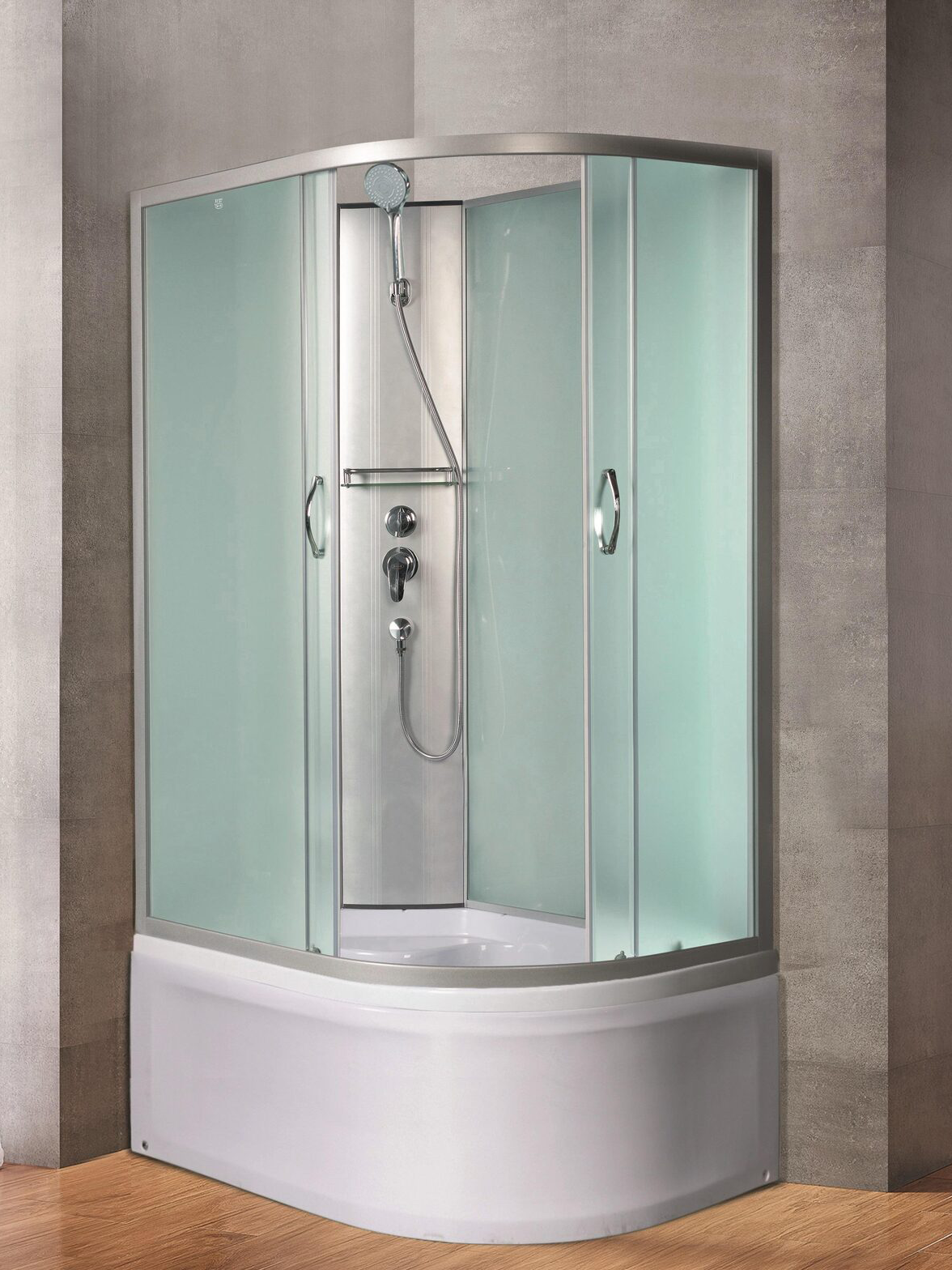 - Оснащение: полочка, ручной душ, смеситель.