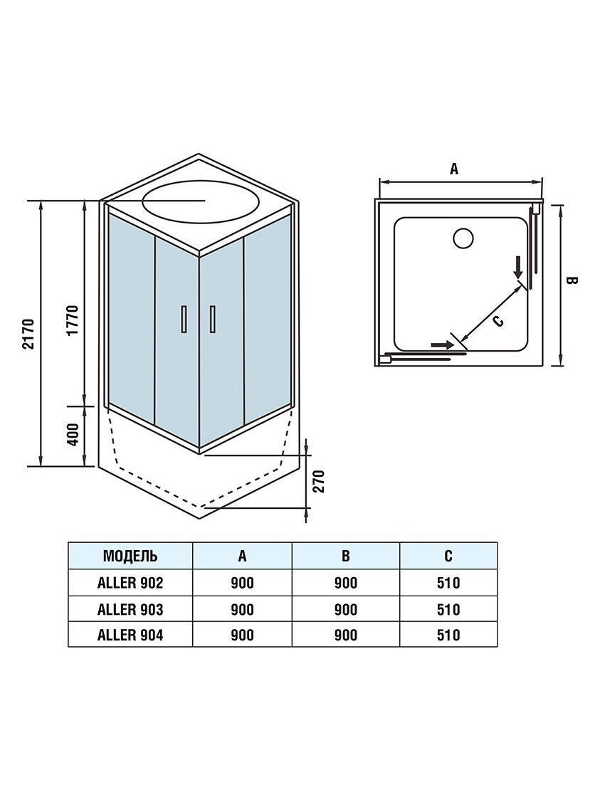 - Размеры (ШхДхВ): 90х90х217 см. Ширина входа: 51 см.
