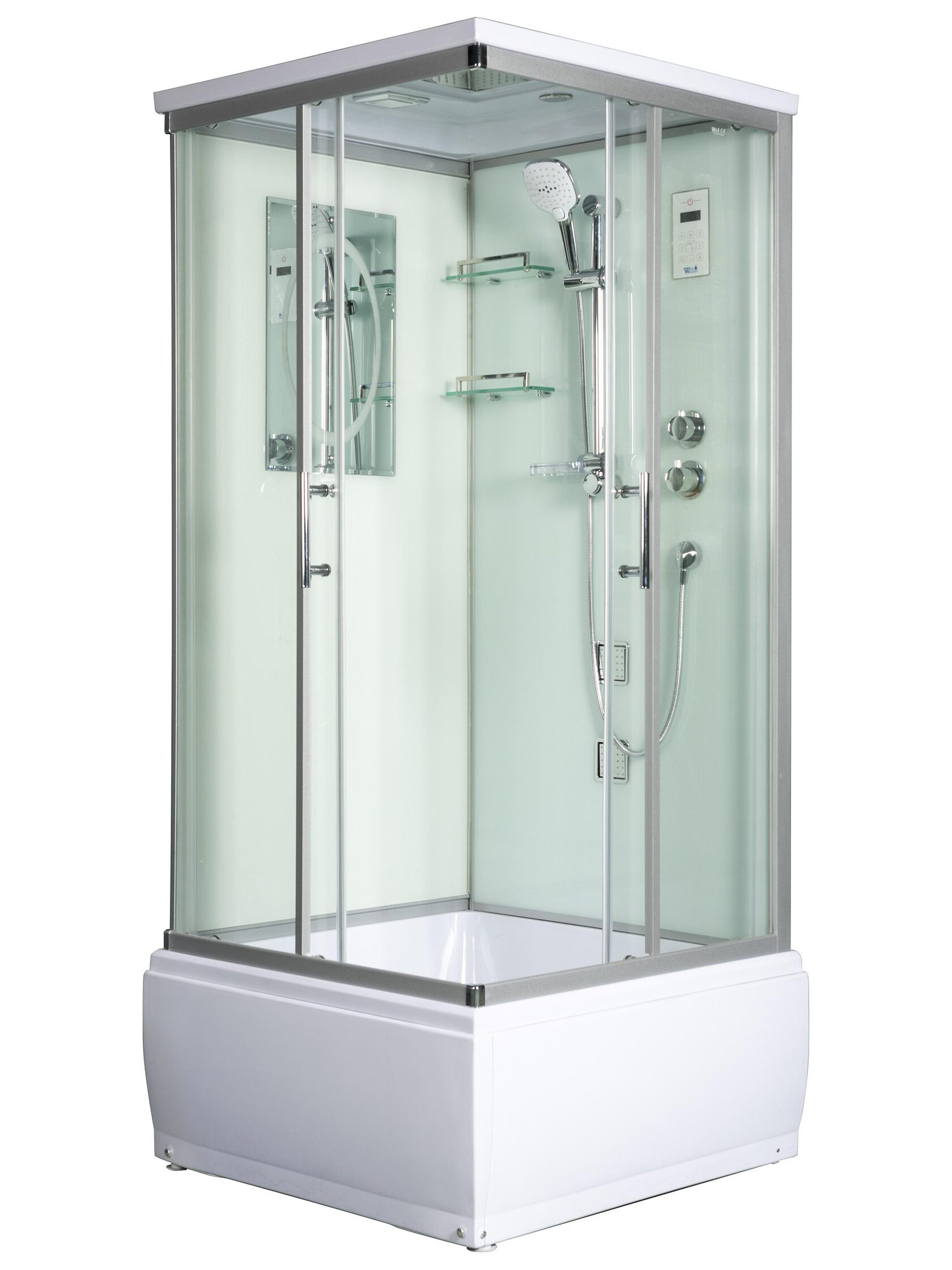Стеклянная душевая кабина WeltWasser WW500 Aller 904 90x90 квадратная, с крышей, с двумя раздвижными дверьми. Гидромассаж спины. Сенсорное управление. Верхний свет LED. Бессиликоновая сборка.
