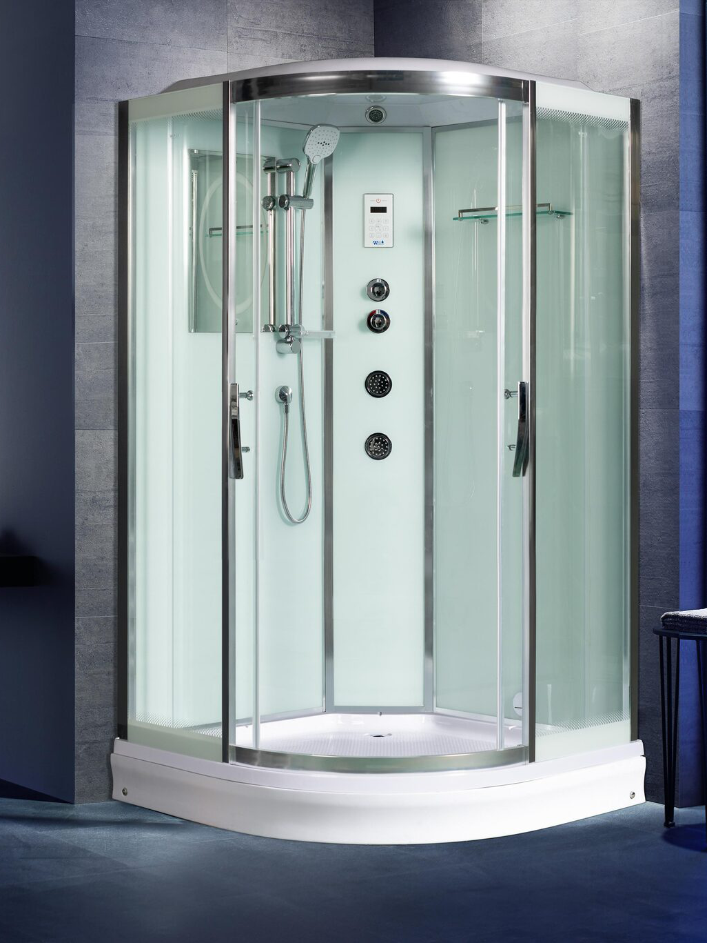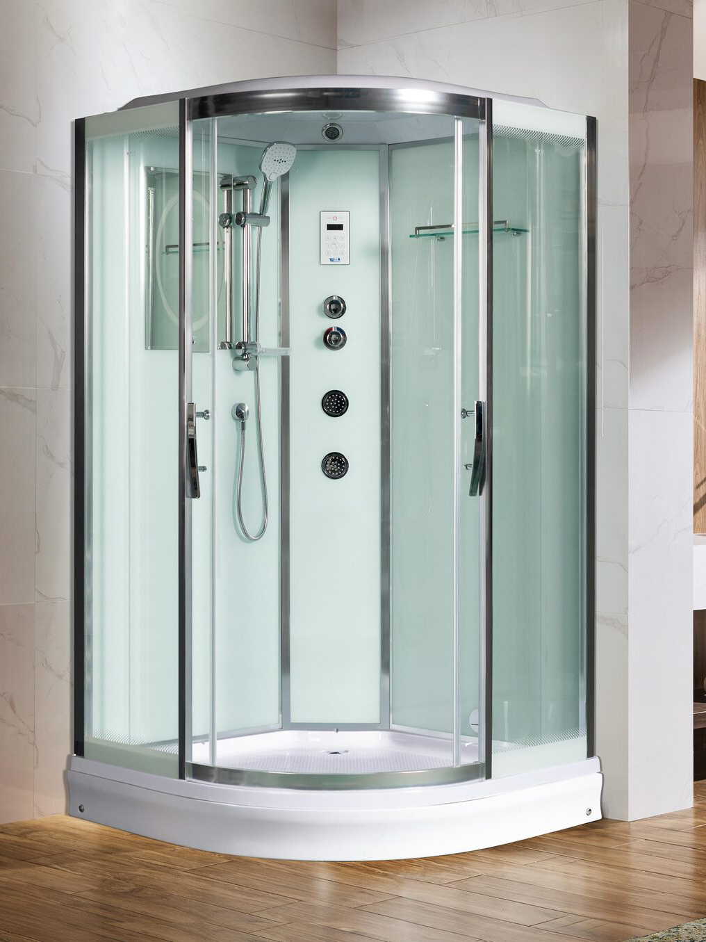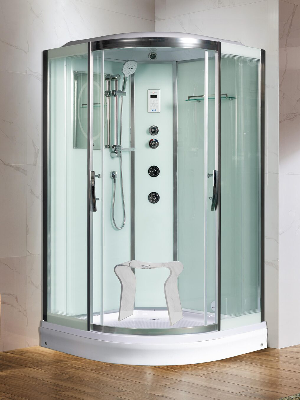 Стеклянная душевая кабина WeltWasser WW500 Emmer 12015 120x120 в форме четверти круга, с крышей, с двумя раздвижными дверьми. Гидромассаж спины. Сенсорное управление. Верхний свет LED. Безсиликоновая сборка.