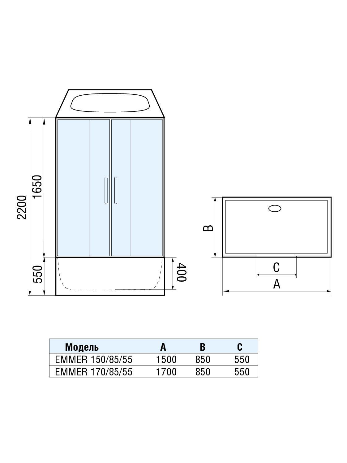 Душевой бокс WeltWasser WW500 Emmer 170/85/55 170х85 10000003926 прямоугольной формы, с крышей, с двумя раздвижными дверьми, с гидромассажем. Бессиликоновая сборка.
