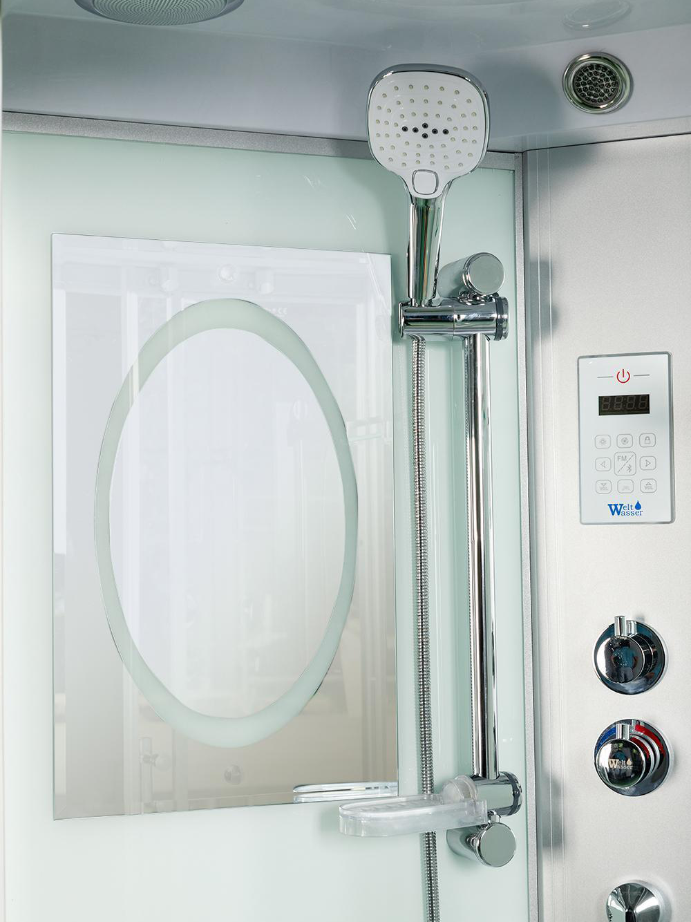 Стеклянная душевая кабина WeltWasser WW500 Halle 1004 100x100 в форме четверти круга, с двумя раздвижными дверьми, с крышей, с сенсорным управлением, с гидромассажем. Бессиликоновая сборка.