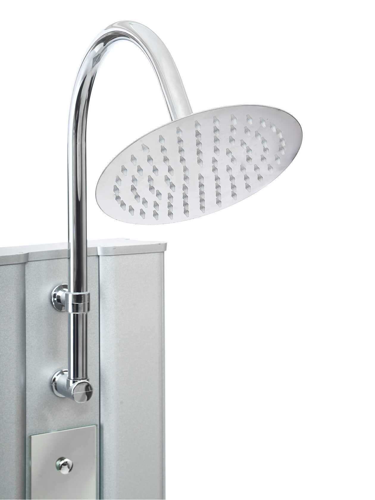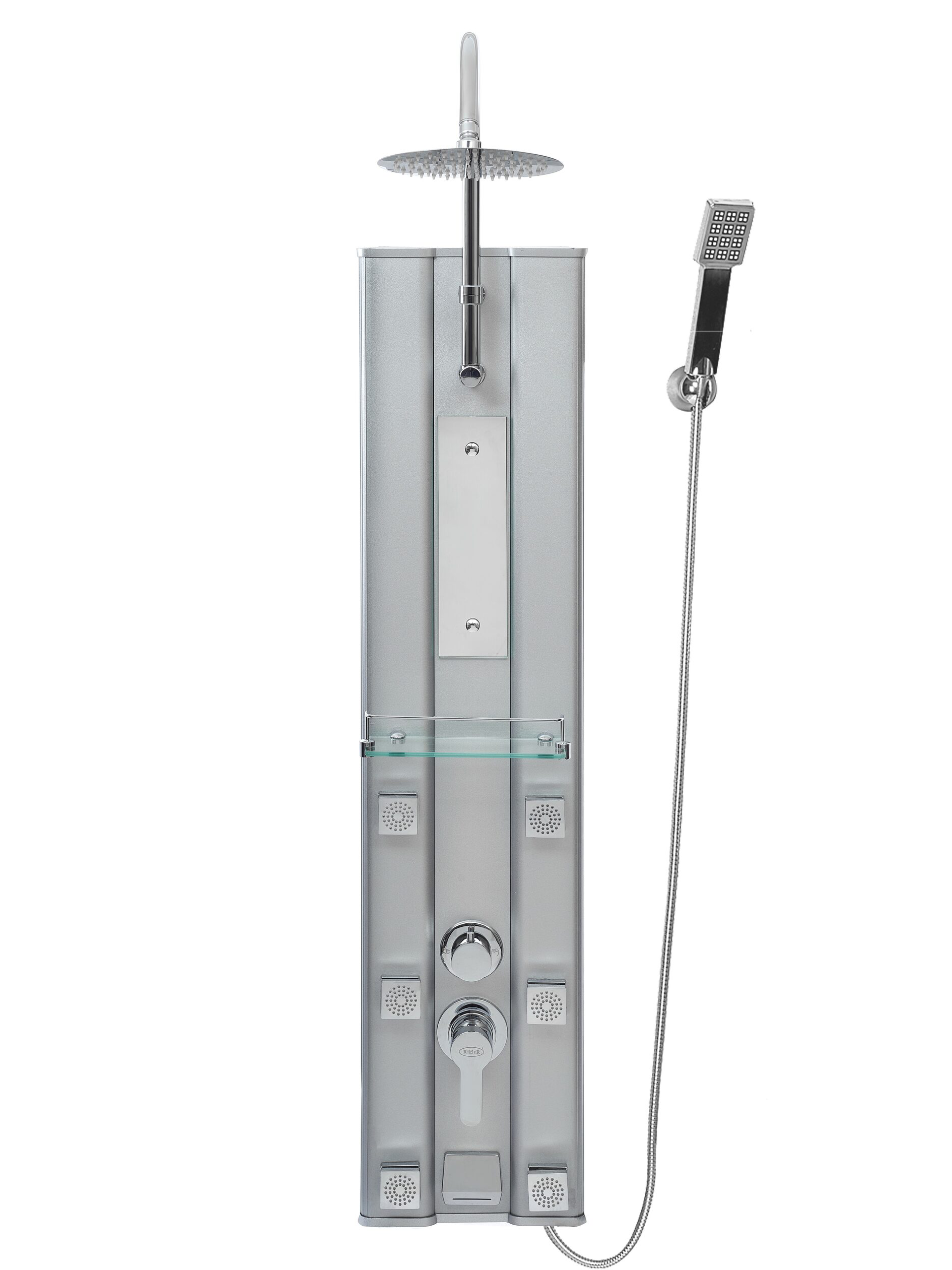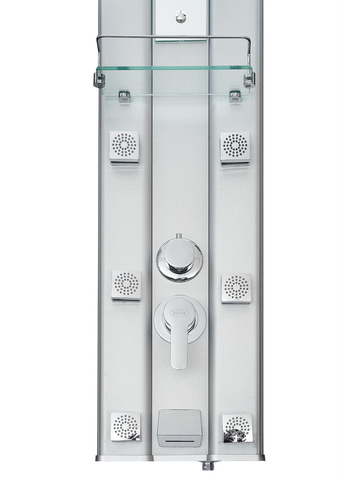 Душевая панель River 10 10000002344. Панель изготовлена из акрила и имеет полочку, верхний душ, зеркало, смеситель, трехпозиционный ручной душ, шесть гидромасссажных форсунок, каскадный излив.