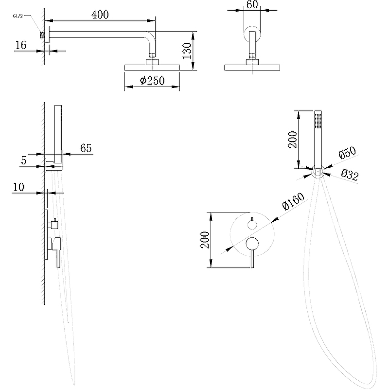 - Диаметр верхнего душа: 250 мм.