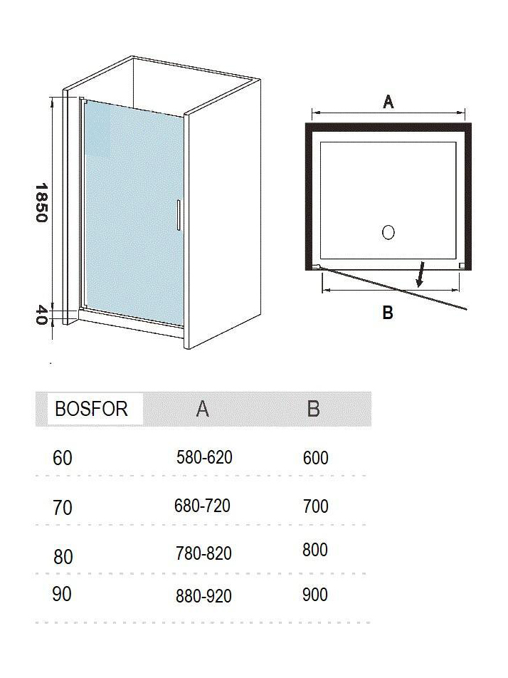 Душевая дверь в нишу River Bosfor 60 МТ 10000003649. Дверь имеет одностворчатую распашную конструкцию, открывающаяся наружу. За счет боковых регулировочных профилей можно отрегулировать ширину двери (+2 см от размера).