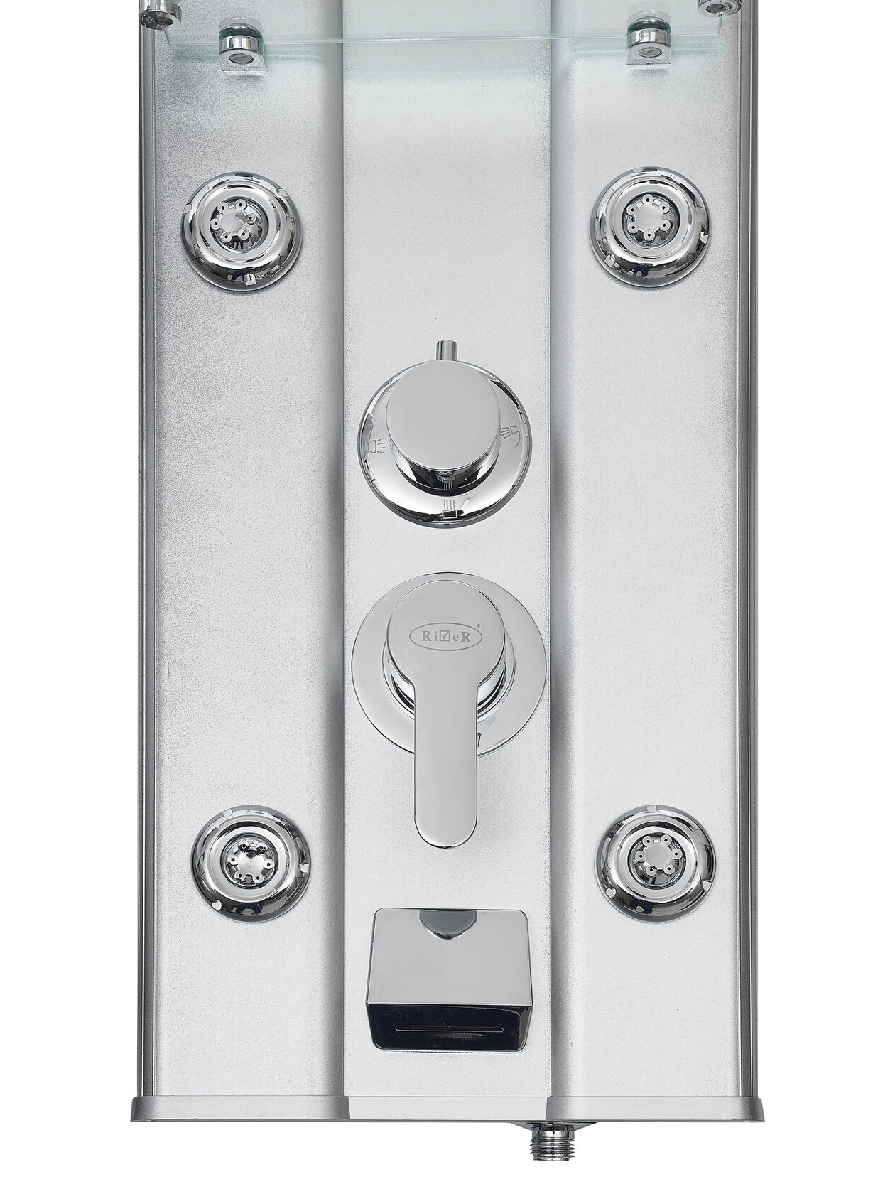 Душевая панель River 01 10000001241. Панель изготовлена из акрила и имеет полочку, верхний душ, зеркало, смеситель, трехпозиционный ручной душ, шесть гидромасссажных форсунок, каскадный излив.