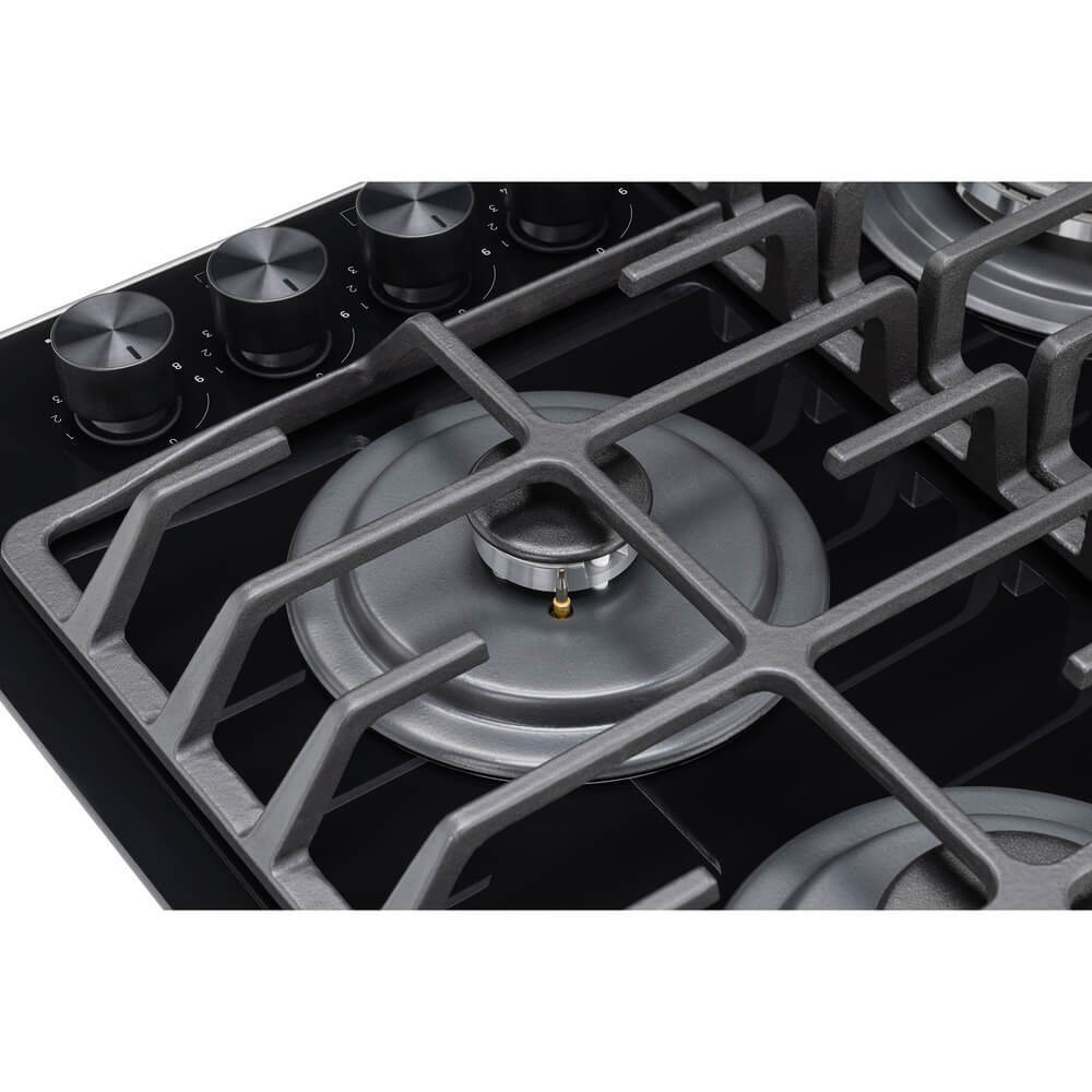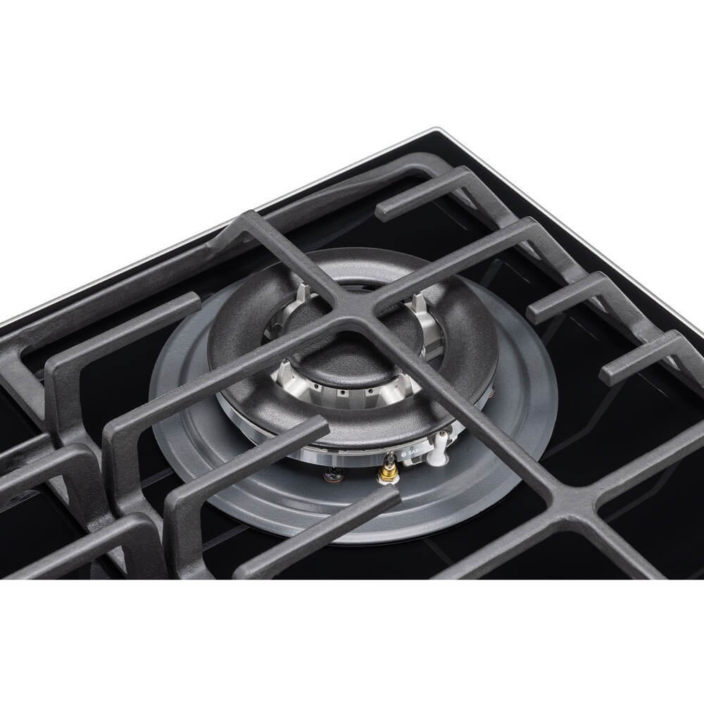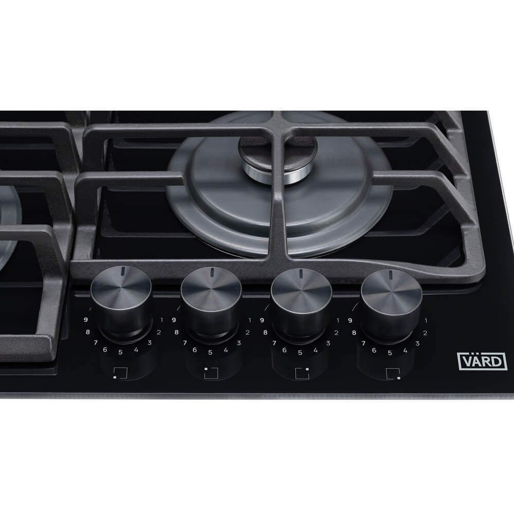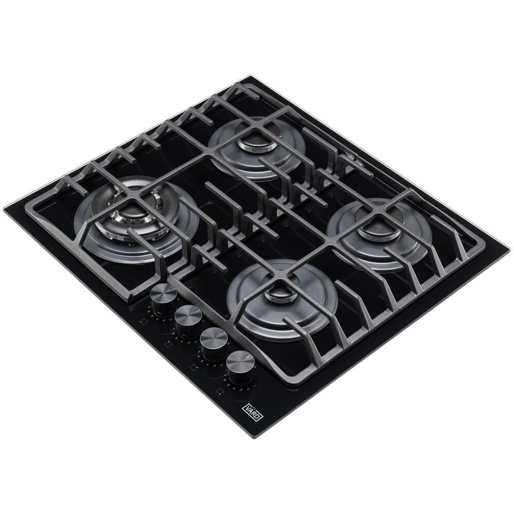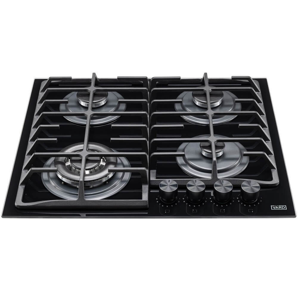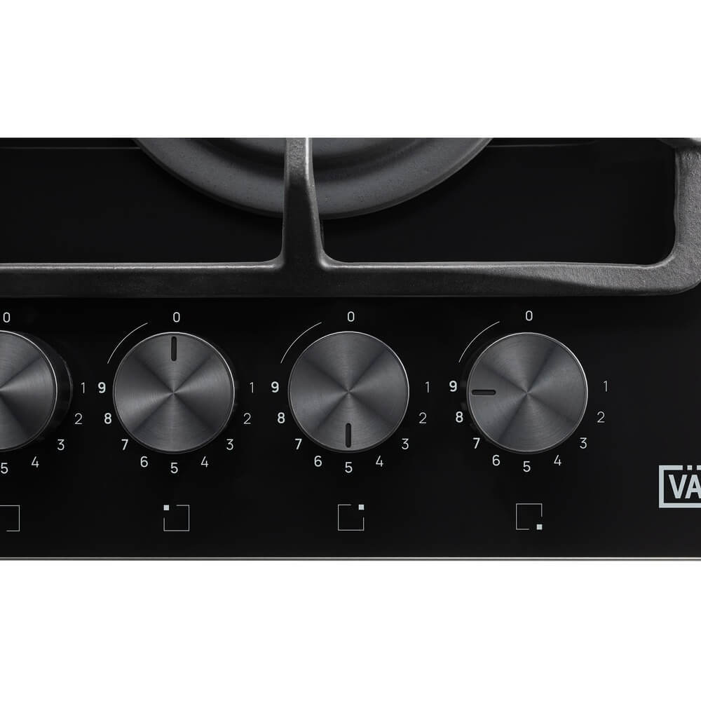 Газовая варочная панель, ступенчаные регуляторы StepFlame, на чёрном закалённом стекле, ширина 60см, чугунные держатели, газконтроль и автоматический автоподжиг, WOK конфорка, 4 конфорки,