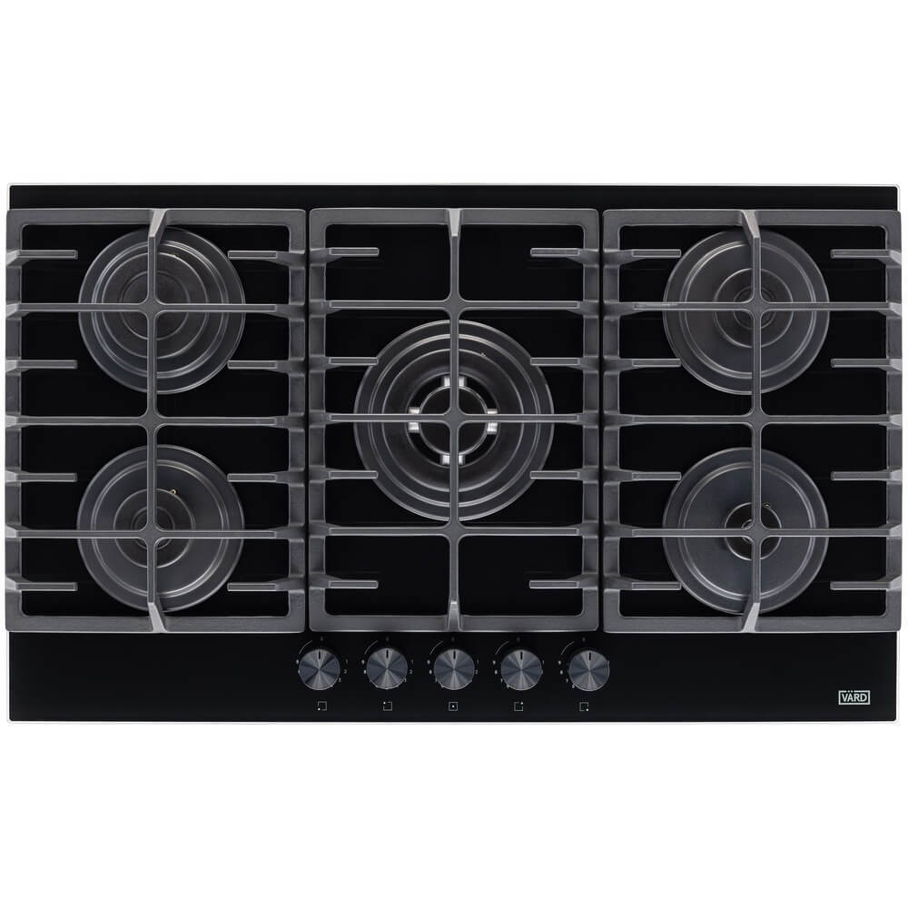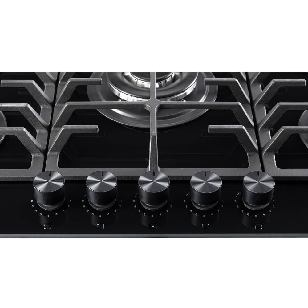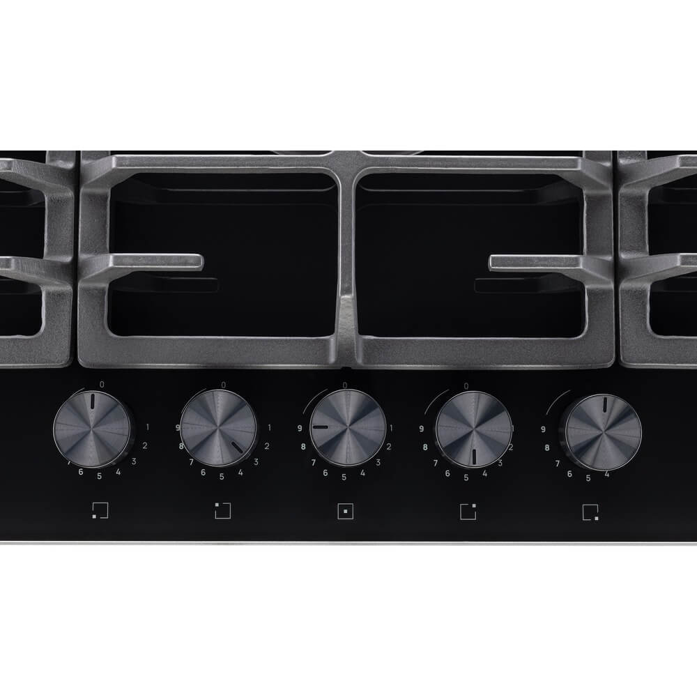 Газовая варочная панель, ступенчаные регуляторы StepFlame, на чёрном закалённом стекле, ширина 90см, чугунные держатели, газконтроль и автоматический автоподжиг, WOK конфорка, 5 конфорок,