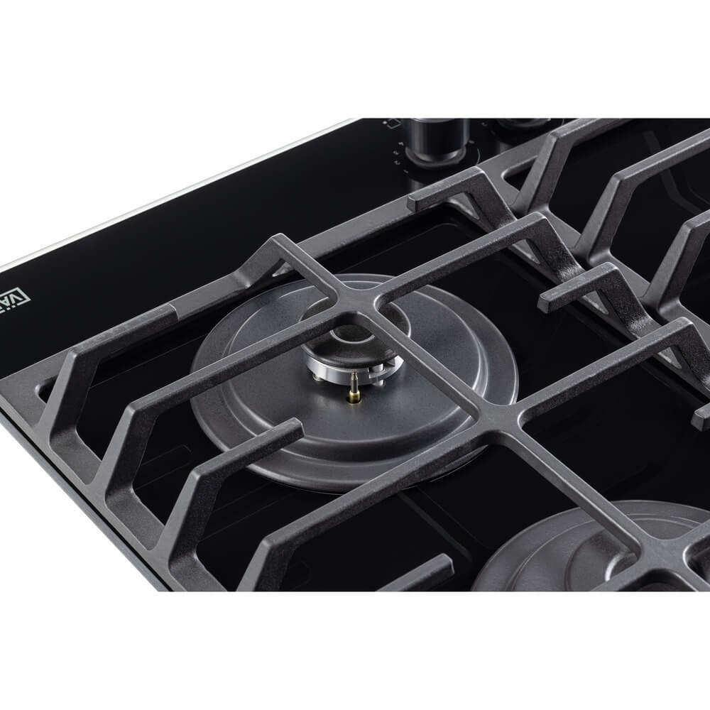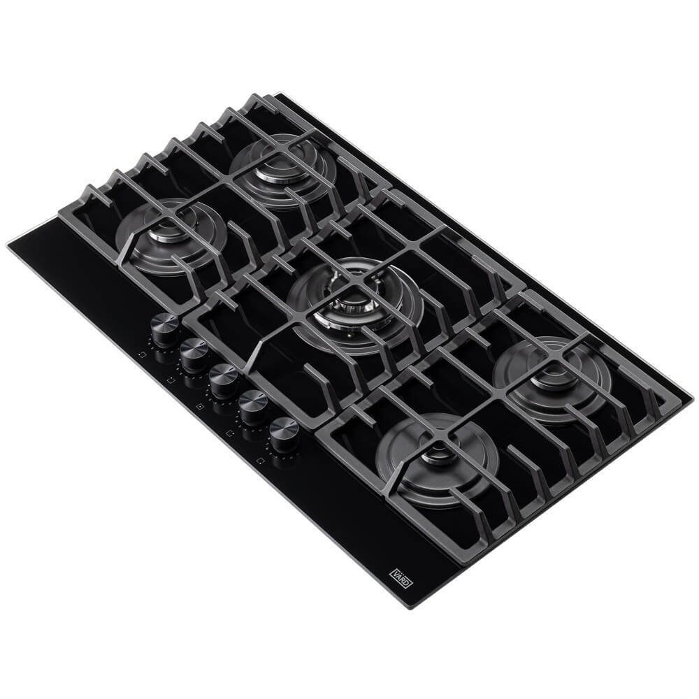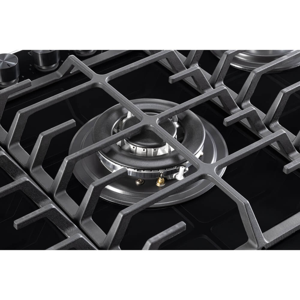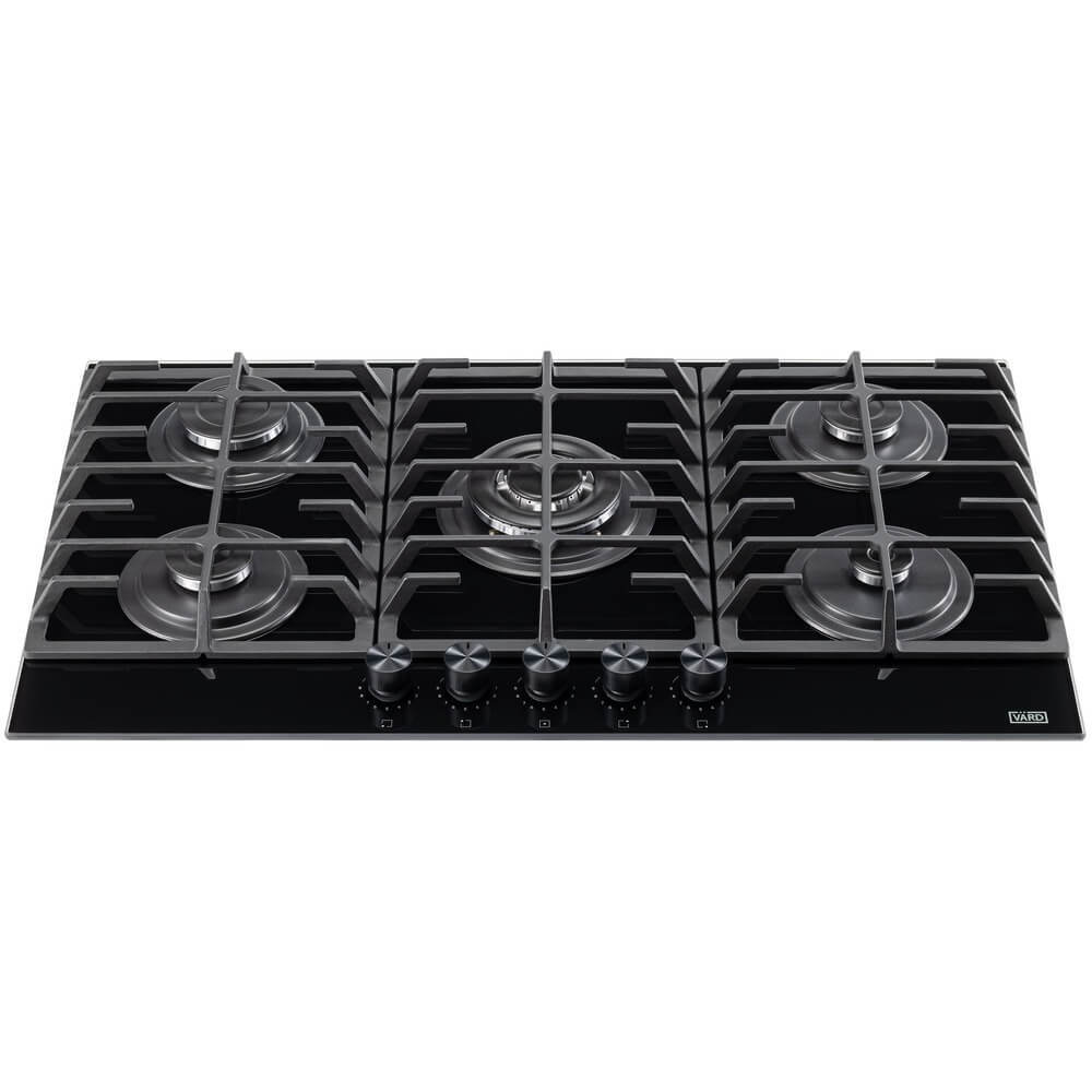 Газовая варочная панель, ступенчаные регуляторы StepFlame, на чёрном закалённом стекле, ширина 90см, чугунные держатели, газконтроль и автоматический автоподжиг, WOK конфорка, 5 конфорок,