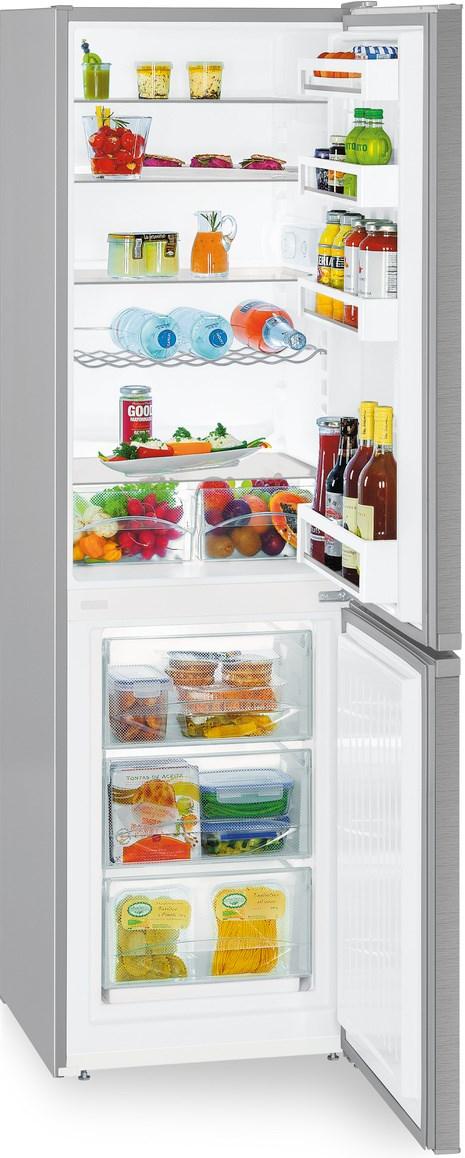 Прибор оснащен четырьмя полками из закаленного стекла, двумя контейнерами для фруктов и овощей, универсальной полкой для бутылок и подставкой для яиц. Морозильная камера имеет три ящика из стекла для удобного хранения замороженных продуктов.