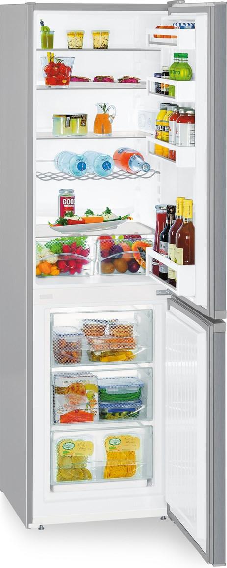 Прибор оснащен двумя камерами: холодильной и морозильной, расположенной снизу. Общий полезный объем аппарата составляет 296 литров, что позволяет хранить большое количество продуктов. В холодильной камере предусмотрено четыре полки из закаленного стекла, три из которых можно регулировать по высоте. Также имеются два контейнера для хранения овощей и фруктов, универсальная полка для бутылок и отделения для хранения консервов. Все полки на дверце выполнены из пластика. Внутреннее освещение на светодиодах обеспечивает хороший обзор всего пространства холодильника.