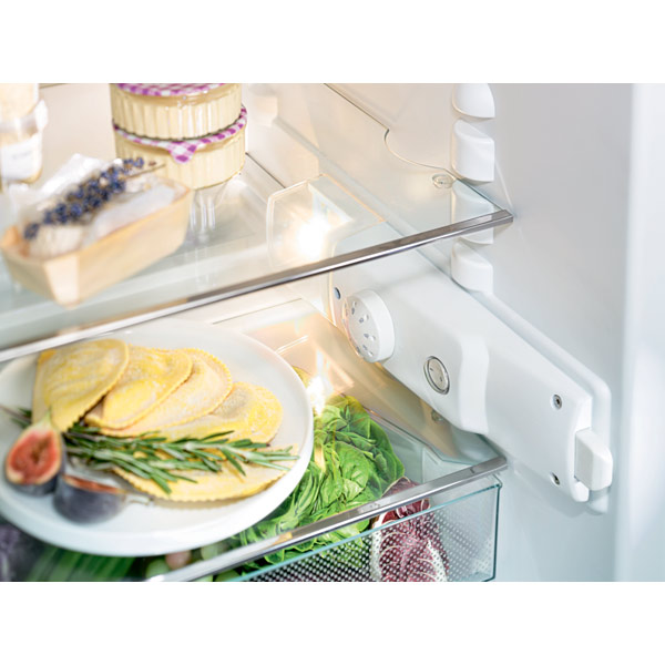 В нижней части прибора расположен прозрачный контейнер для хранения фруктов и овощей. Как и съемные полки, его легко вынимать и мыть вручную мягкой влажной тканью или в посудомоечной машине. Приятное глазу освещение осуществляется лампой накаливания в верхней части. Имеется встроенная эргономичная ручка для открывания двери..