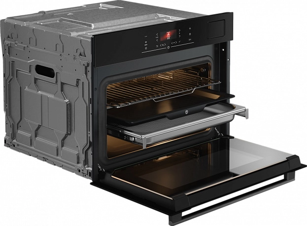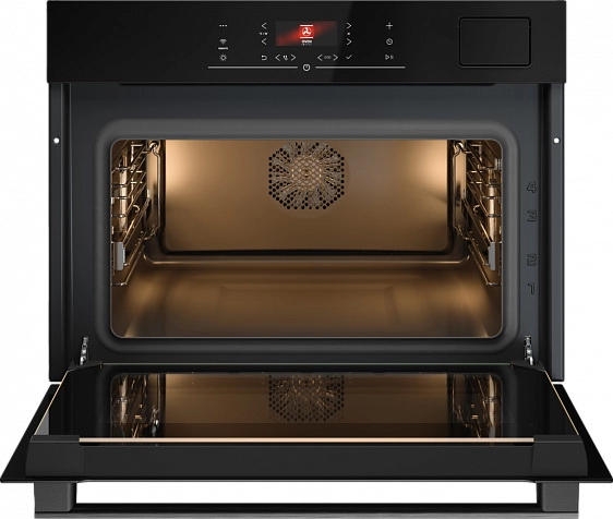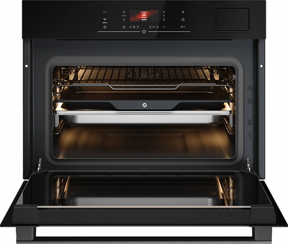 Объём 51 л и широкий диапазон температур от 30 до 250°C позволят готовить всё — от деликатного томления до интенсивного запекания. Интеллектуальное управление через 3" TFT‑дисплей с сенсорными кнопками обеспечивает точный контроль: система Celsius® Cooking гарантирует погрешность не более ±1°C, а функция сохранения рецептов упрощает повторение удачных блюд. Технология 360° Air Flow равномерно распределяет горячий воздух на всех уровнях, обеспечивая идеальную пропечённость и равномерный румянец. В арсенале — 14 режимов приготовления и 112 автоматических программ, в том числе режим AirFry для хрустящей и менее жирной корочки, а также три режима приготовления на пару и возможность су‑вид для профессионального результата. Для удобства предусмотрены телескопические направляющие на одном уровне и плавный механизм открытия/закрывания дверцы с четырёхслойным остеклением, которое снижает нагрев внешней поверхности. Внутренняя поверхность покрыта стойкой к загрязнениям пиролитической эмалью; доступны режимы пиролитической очистки и Aqua Clean для быстрого ухода. В комплекте идут универсальный противень, решётка, два противня из нержавеющей стали (с перфорацией и без) и термозонд для контроля внутренней температуры блюд. Двустороннее галогеновое освещение позволяет наблюдать за процессом без лишних открываний. Дополнительные преимущества — калибровка температуры, функция сохранения персональных настроек и встроенный модуль Wi‑Fi для дистанционного управления и интеграции с умным домом.
