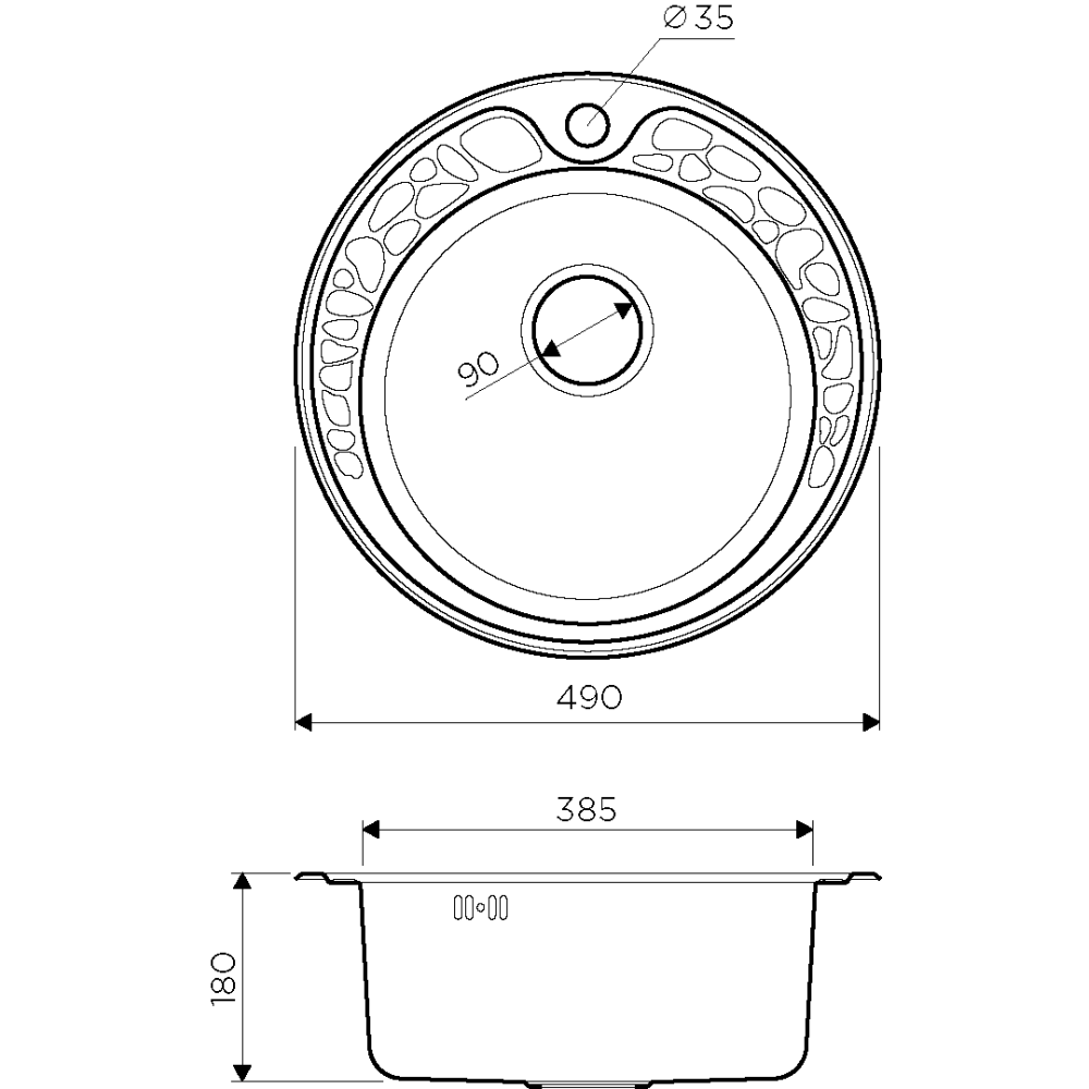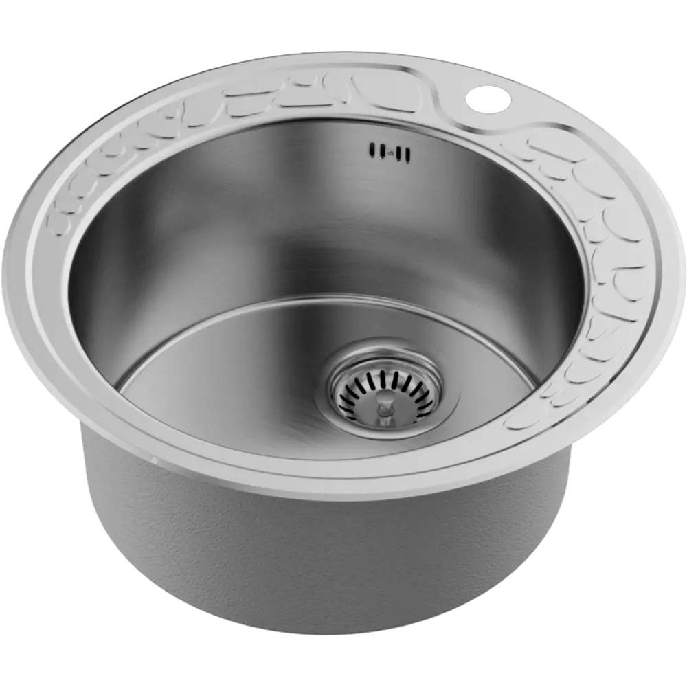 Дизайн круглой кухонной мойки выдержан в классических традициях. Интересная деталь — широкая кромка с изящным объемным орнаментом в виде камней, которая эффектно подчеркнет оригинальность оформления кухни.