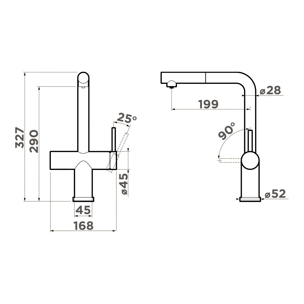смеситель представляет собой интересное функциональное исполнение. Подача фильтрованной воды через нажатие кнопки, холодной и горячей воды через рычаг. Вытяжной шланг (400 мм) всегда можно задействовать для эффективного и комфортного использования, будь то мытьё крупной посуды или наполнение больших ёмкостей — при любом размере мойки.