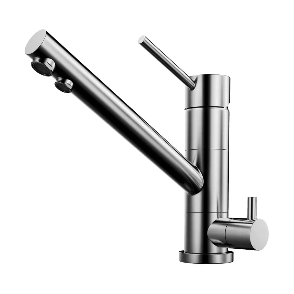 Японские производители современной сантехники не перестают радовать покупателей необычными девайсами. Одним из них является новый вид смесителя Omoikiri Tonami, который имеет необычный дизайн. При изготовлении данной модели используется только высококачественная латунь. Она имеет привлекательную матово-никельную окраску, которая будет выглядеть весьма солидно на любой кухне.