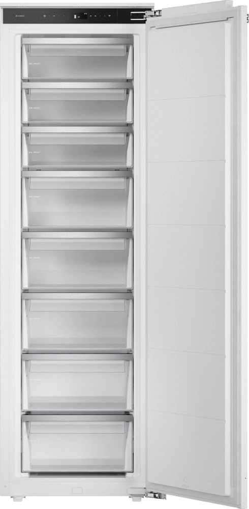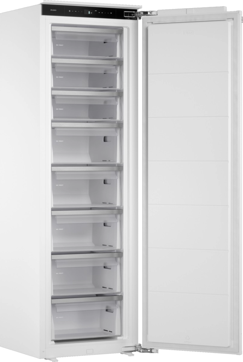 Asko RBF 576 DND — встраиваемая морозильная камера 213 л с 8 ящиками на телескопах. NoFrost и автоматика исключают иней, Fast Freeze ускоряет заморозку. Сенсорное управление с дисплеем и адаптивным контролем держит стабильную температуру. Door-on-Door, энергоэффективность A++, тихая и надежная.