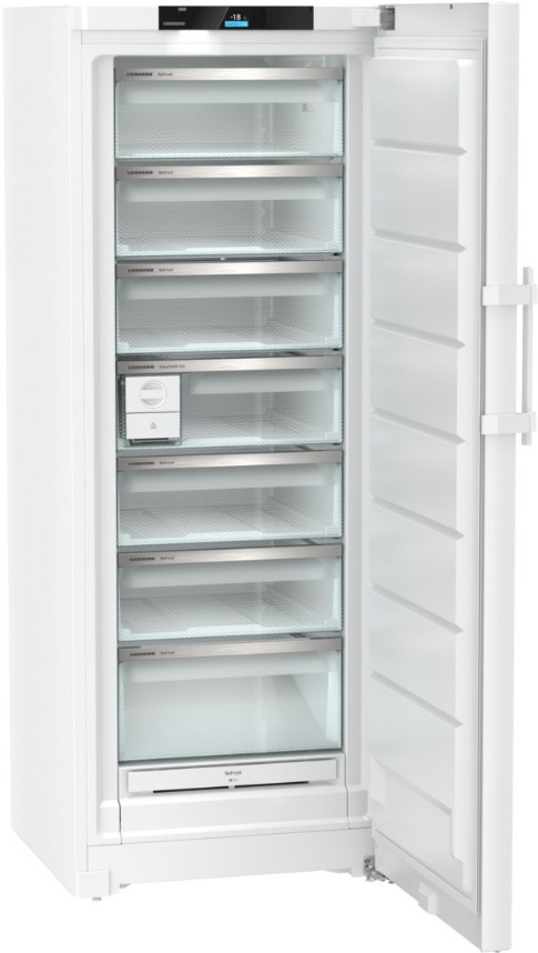 Система охлаждения NoFrost и автоматическая система размораживания обеспечивают эффективное и равномерное охлаждение продуктов. Мощность замораживания составляет 16 кг в сутки, что позволяет быстро заморозить большое количество продуктов. Внутреннее пространство морозильника организовано с помощью семи пластмассовых ящиков, пять из которых размещены на телескопических шинах. Это обеспечивает удобное и эффективное использование пространства морозильника. Кроме того, есть поднос для замораживания и система VarioSpace, которая позволяет настраивать внутреннее пространство морозильника в соответствии с потребностями пользователя. Морозильник оснащен ледогенератором EasyTwist с емкостью для воды.