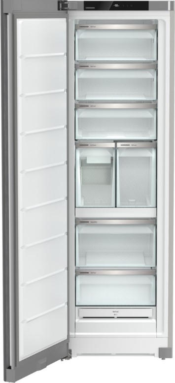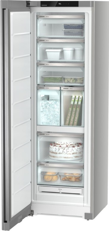 Морозильник Liebherr SFNsfe 5247 — это отдельностоящая модель из премиальной линейки BluPerformance, отличающаяся изысканной внешностью и функциональностью. Она выделяется своим элегантным минималистичным дизайном. Корпус выполнен в серебристом цвете из качественной и надежной стали. Все элементы, включая вертикальную дверную ручку, скрыты от глаз, нет никаких лишних деталей. Сенсорная панель управления расположена за дверцей над камерой. Благодаря конструкции InteriorFit устройство можно установить вплотную к стенам, не опасаясь перегрева мебели.