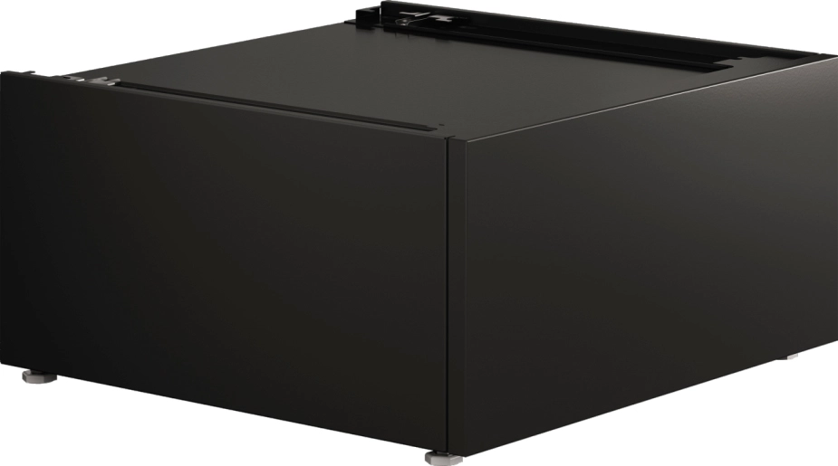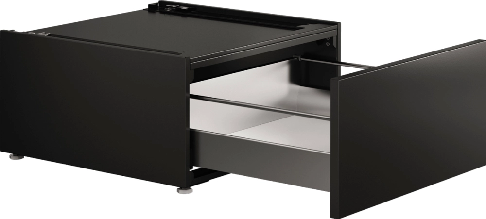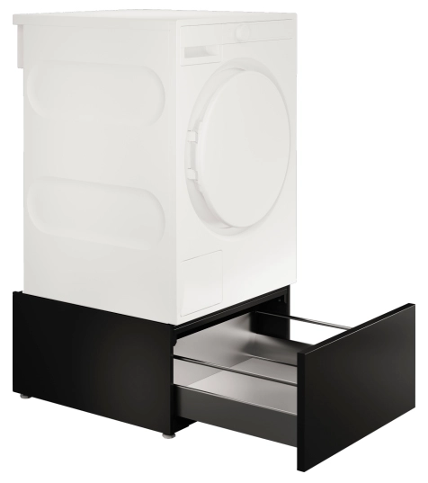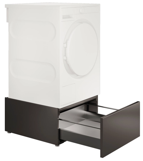 Напольный ящик HP320G с выдвижной полкой — практичное решение для хранения моющих средств, вешалок и инструкций рядом со стиральной или сушильной машиной Asko Pro Home. Графитовый корпус гармонично сочетается с техникой, а стальная полка добавляет удобства и прочности.