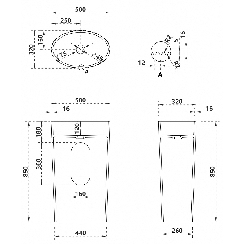 - Размеры (ШхВхГ): 500х850х320 мм.