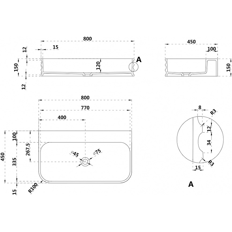 - Размеры (ШхВхГ): 800х150х450 мм.