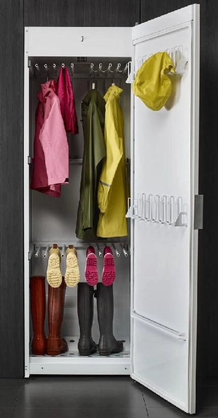 Шкаф рассчитан на загрузку до 4 кг сухого белья и предлагает общую длину развешивания, эквивалентную 16 м бельевой верёвки. Производительность вентилятора 180 м³/ч и скорость испарения влаги 17 г/мин поддерживаются нагревателем мощностью 1500 Вт, который равномерно подаёт тёплый воздух по всему объёму. Набор удобных аксессуаров включает выдвижные штанги для развешивания, специальные держатели для перчаток и носков, а также полку для сушки обуви — всё это делает шкаф универсальным решением для верхней одежды, трикотажа, детских вещей и обуви.