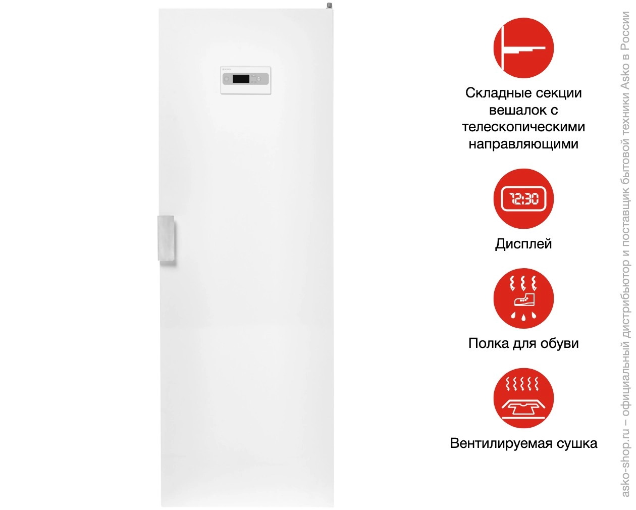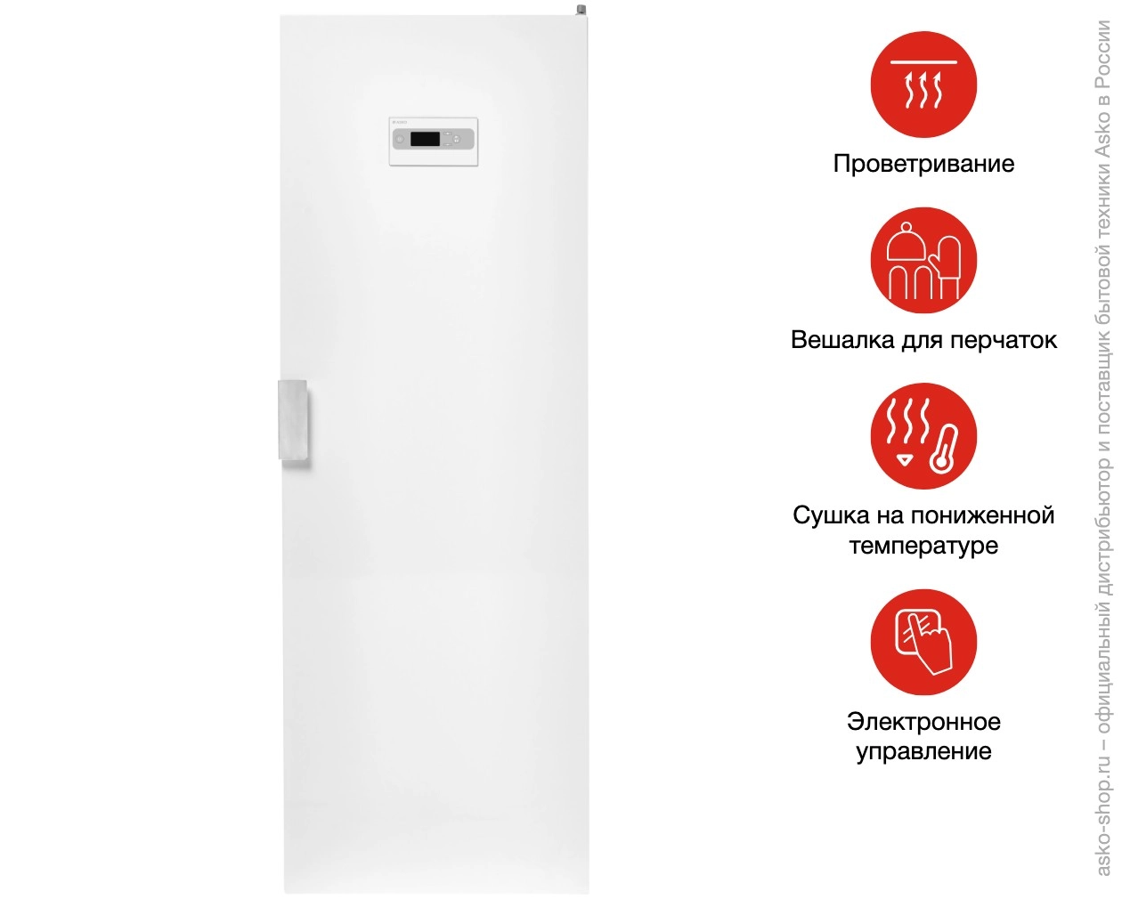 DC7784V.W — вентиляторный сушильный шкаф в белом корпусе, созданный для мягкой и аккуратной сушки вещей, которые нельзя подвергать центрифуге или барабанной сушке. Вертикальная конструкция с продуманной циркуляцией воздуха обеспечивает равномерное распределение тёплого потока, благодаря чему одежда и обувь высыхают без складок и сохраняют форму и текстуру тканей.