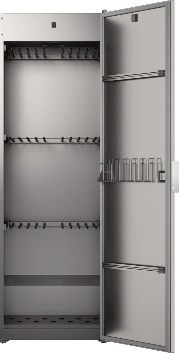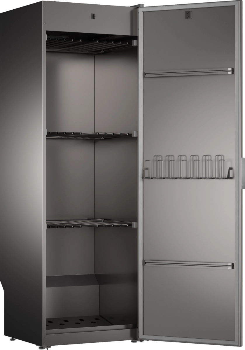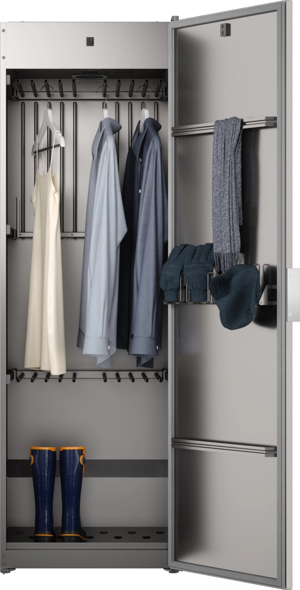 Сушильный шкаф высотой 184 см для деликатной сушки одежды и обуви, нежелательной в барабанных сушилках. Компактный и функциональный, обеспечивает мягкий тёплый поток для равномерного высыхания без заломов и деформации. Вместимость до 4 кг (эквивалент 16 м развешивания), выдвижные штанги, держатели для мелких вещей и полка для обуви.