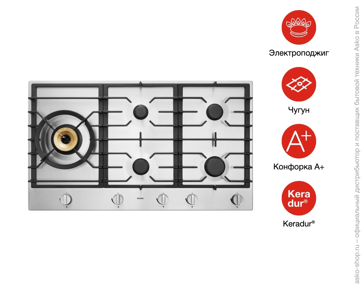 - Варочная поверхность имеет пять горелок, изготовленных из термостойкого сплава Keradur. Он обеспечивает прочность и долгую эксплуатацию. _x000D_