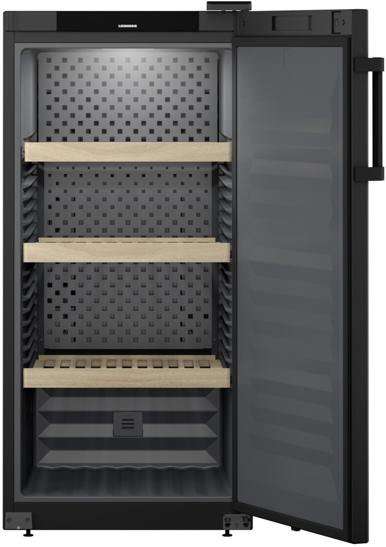 Винный шкаф Liebherr WSbl 4201 — изысканная модель, которая станет превосходным дополнением к вашей кухне или гостиной. Корпус и непрозрачная дверь выполнены из нержавеющей стали. Этот материал отличается долговечностью и надежностью. Эргономичная ручка, расположенная справа, позволяет без труда пользоваться устройством. В качестве основного цвета выбран глубокий черный оттенок с матовым покрытием. Элегантный и эстетичный дизайн подойдет к любому интерьеру. Полки изготовлены из натурального дерева. Управление осуществляется через электронный дисплей в верхней части дверцы. С его помощью можно точно настроить температуру в диапазоне от 5 до 20 градусов.