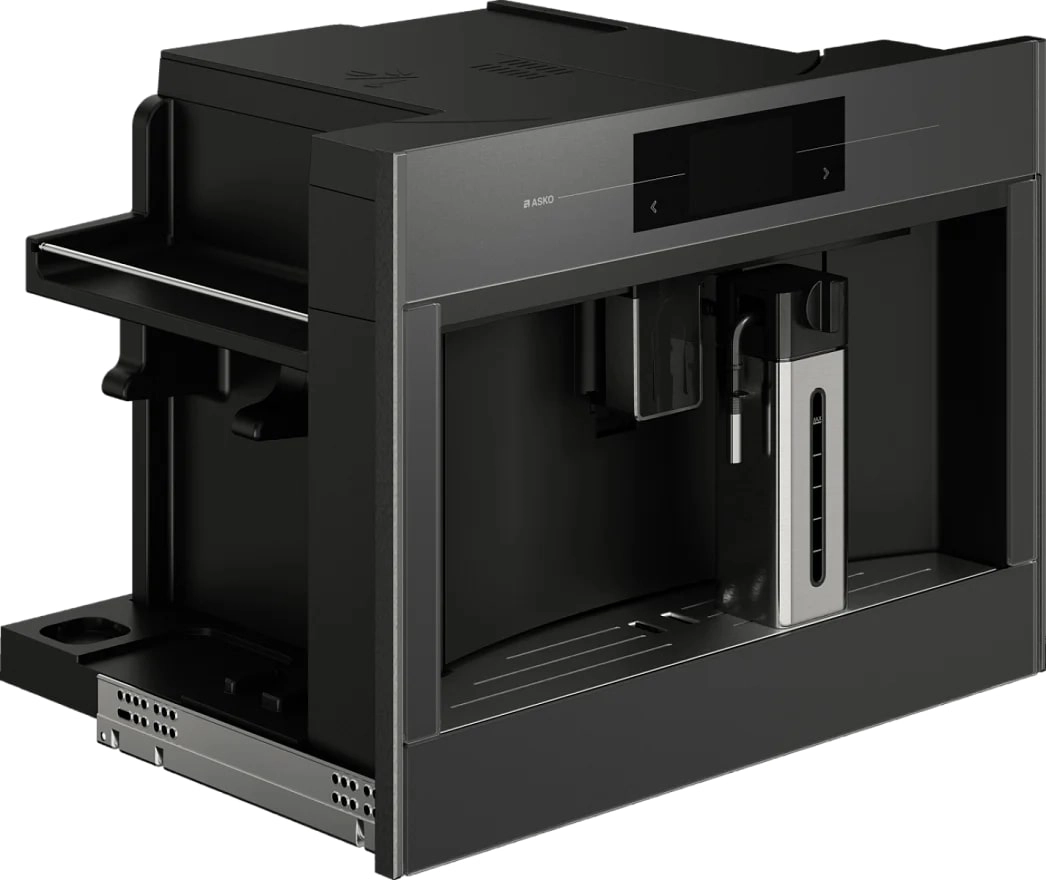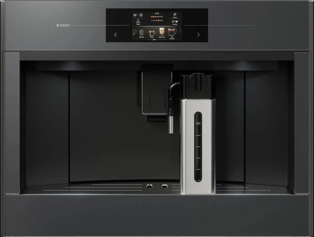 Встраиваемая кофемашина Asko CM8478GG с автоматическим капучинатором для идеального вспенивания молока. Предварительный помол и приготовление, сенсорный TFT-дисплей, таймер, сохранение рецептов. Эспрессо, капучино, горячее молоко и вода; управляется через Wi-Fi.