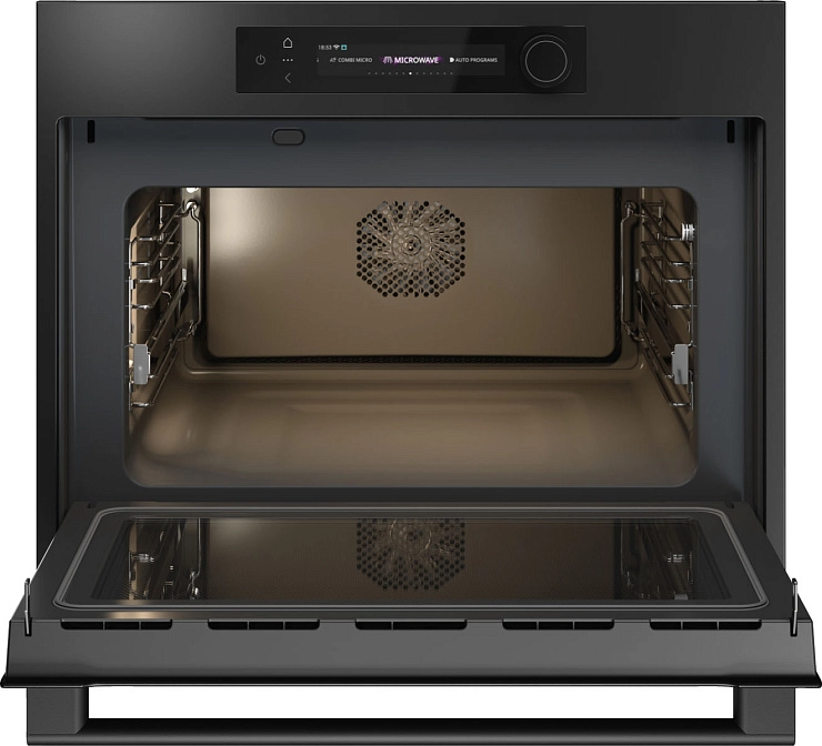 Центр управления — 6" TFT‑дисплей с чёткой графикой, сенсорными зонами и поворотным селектором. Интерфейс помогает быстро выбрать один из 6 уровней мощности или запустить одну из 40 автоматических программ: от базового подогрева порций до сложных сценариев с многоступенчатым комбинированием. Телескопические направляющие, частично выдвигаемые на одном уровне, упрощают работу с тяжёлыми формами и повышают безопасность при извлечении посуды. Дверца открывается и закрывается мягко, трёхслойное стекло и система внутреннего охлаждения поддерживают приемлемую температуру внешней поверхности даже при интенсивных режимах.