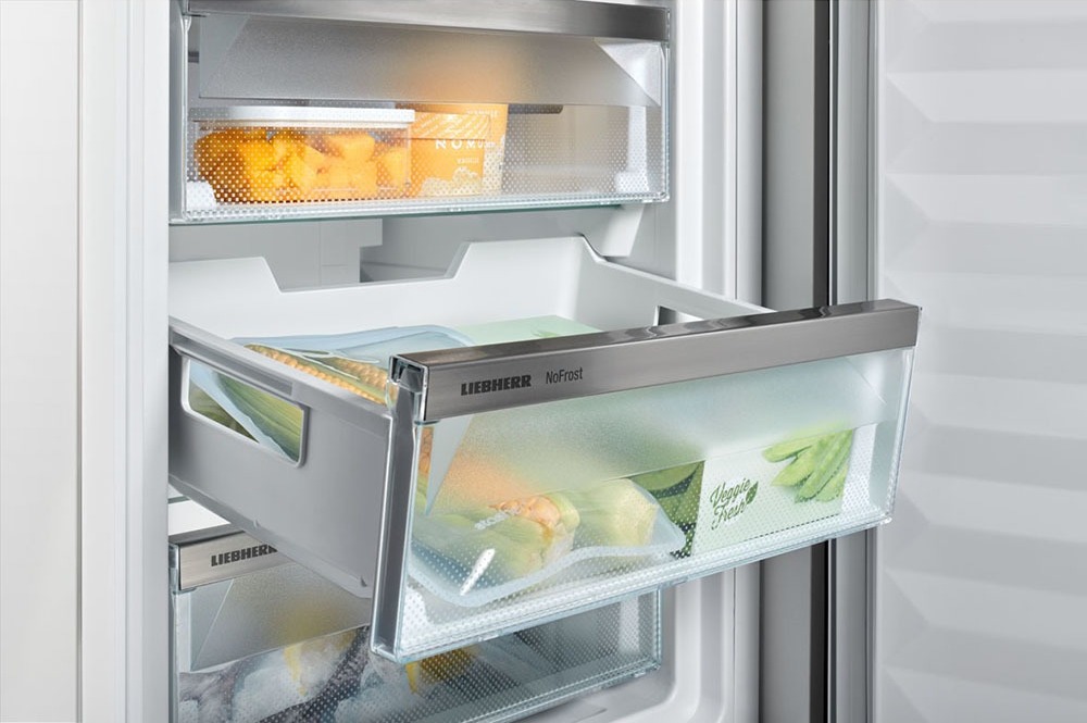 Внутри встраиваемой морозильной камеры Либхер SIFNf 5128 Plus NoFrost вы найдете 8 вместительных ящиков из прочного стекла по технологии FrostSafe. Она помогает сохранять герметичность и предотвращать проникновение тепла и нарушение температурного режима. В комплектацию также входит поднос для замораживания и специальный лоток для льда. Встроенные направляющие облегчают доступ к продуктам. Модель имеет несколько автоматических программ, например, режим SabbathMode, который выключает все световые индикаторы и снижает уровень шума на определенное время, функцию BottleTimer для подготовки напитков к подаче и PartyMode для быстрой заморозки больших партий продуктов.
