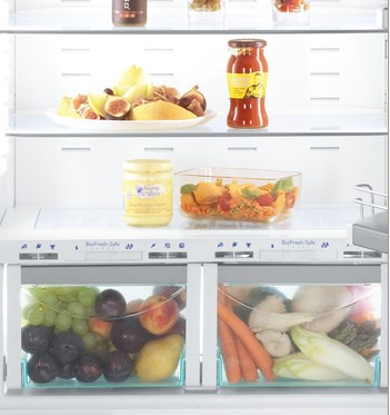 Liebherr ECBN 5066 Premium Plus встраиваемого типа. Нестандартной ширины подойдет для творческих людей нетерпящих стереотипы. Стальной корпус повышенной прочности устойчив к внешним воздействиям. Управление системы осуществляется с помощью сенсорного жидкокристаллического дисплея MagicEye с цифровой индикацией температуры. Благодаря технологии FrenchDoor обеспечено комфортное расположение прибора и дверь открывается под углом 115 градусов, что позволяет разместить больше продуктов без хлопот. Полки выполнены из стекла с металлической окантовкой. Система ящиков имеет частично выдвижные телескопические направляющие. Освещение холодильной и морозильной камер — светодиодное, яркое и энергоемкое, позволяющее без труда найти нужную вещь в темное время суток. Технология PowerCooling обеспечивает быстрое охлаждение свежих продуктов. И даже при частом открывании двери поддерживает нужную температуру. На дверце расположены 3полки, лоток для яиц,1 отделение для бутылок и два для консервов. BioFresh — это определенное место в холодильнике в котором имеется две зоны с различными значениями температуры и влажности. DrySafe отвечает за сохранность молочных продуктов мяса и рыбы. HydroSafe идеально подходит для овощей и фруктов.