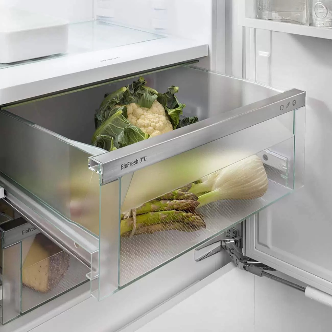 Двухкамерный холодильник ICBNSe 5123 Plus — встраиваемая модель с зоной свежести BioFresh и системой охлаждения NoFrost. Имеет скользящее крепление дверей.