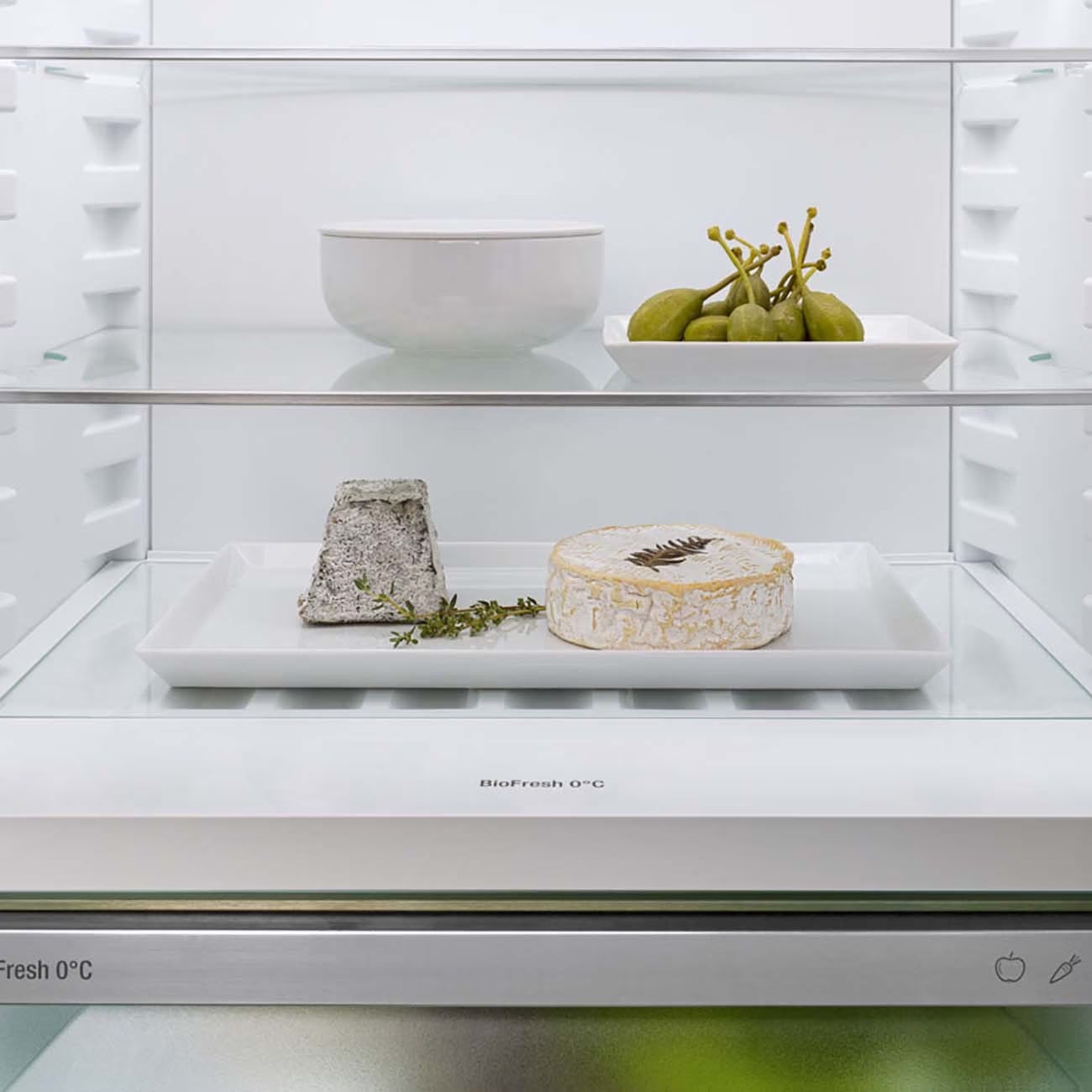 - В холодильной камере кроме полок находятся зона BioFresh с двумя контейнерами общим объёмом 74 л для фруктов и мясомолочных продуктов. В них поддерживается сухой воздух и температура около нуля градусов.