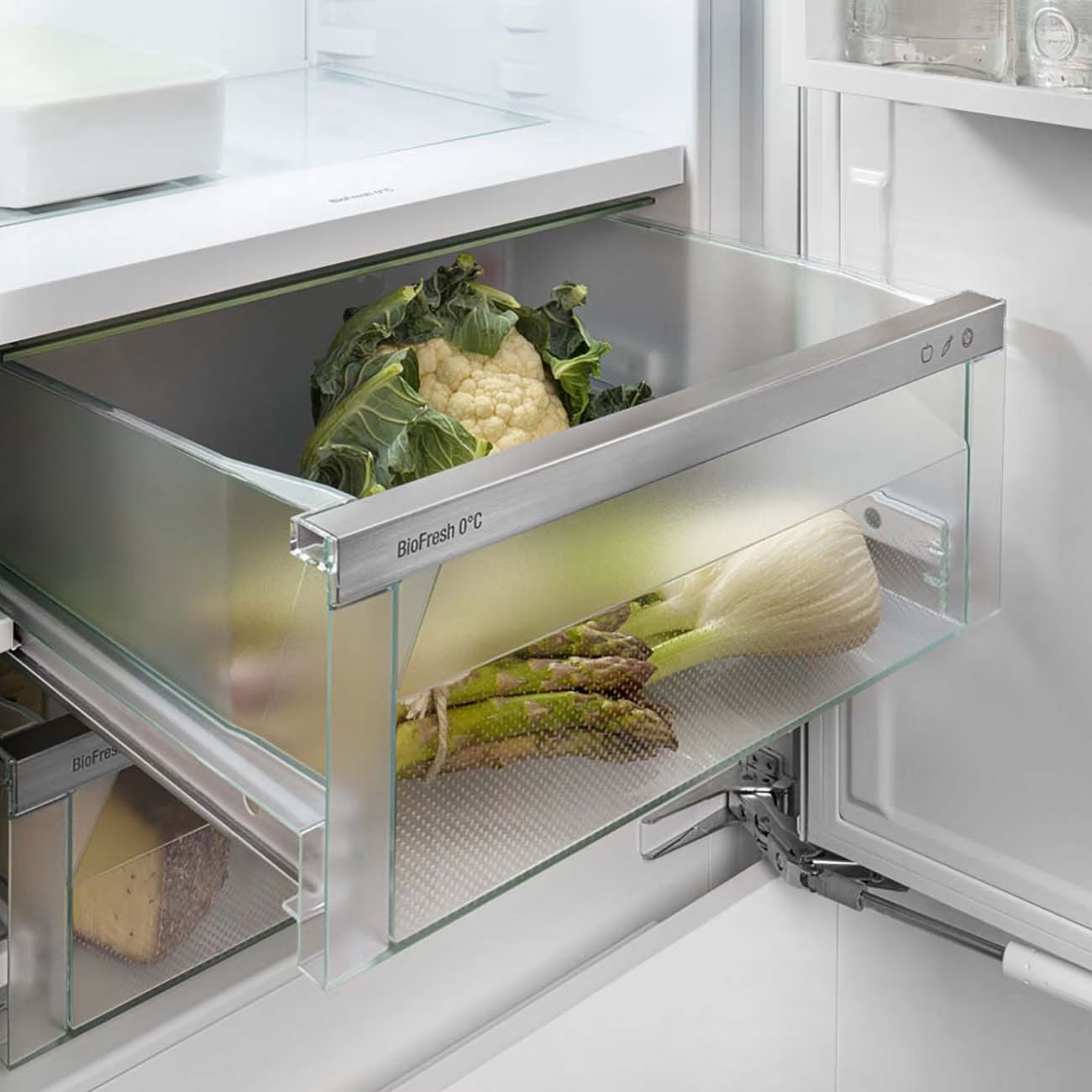 Двухкамерный холодильник Liebherr ICBSd 5122 Plus — встраиваемая модель со скользящими креплениями дверцы. Применение ящиков зоны BioFresh возможно в качестве Fruit-&Vegetable-Safe или Meat-&Diary-Safe.