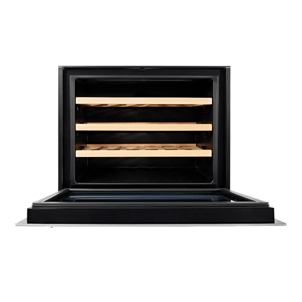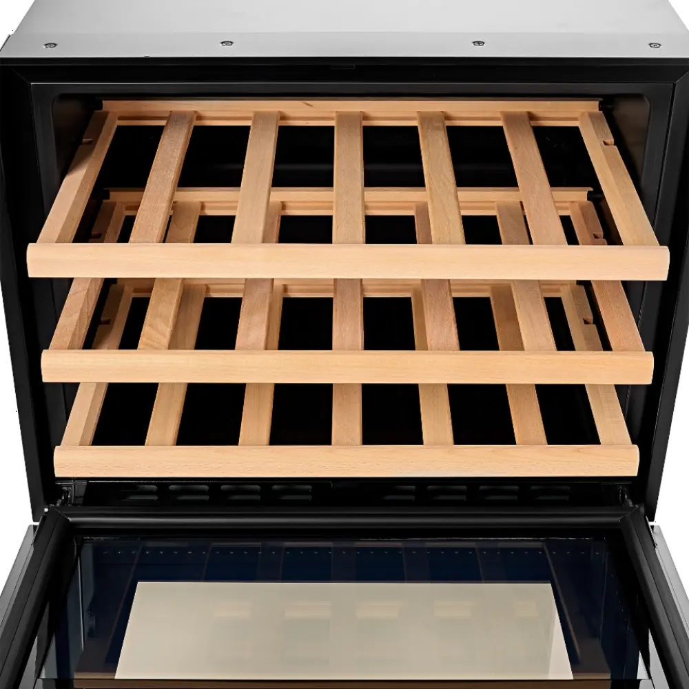 Вмещает 24 бутылки и в том числе бутылку игристого вина, 45 литров, температура от 5 до 20 градусов, деревянные полки
